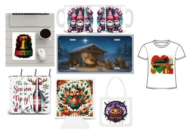 We design and sell a wide variety of custom products, including Tumblers, Mugs, Tote Bags, T-Shirts, Koozie Sleeves, License Plates, and more.